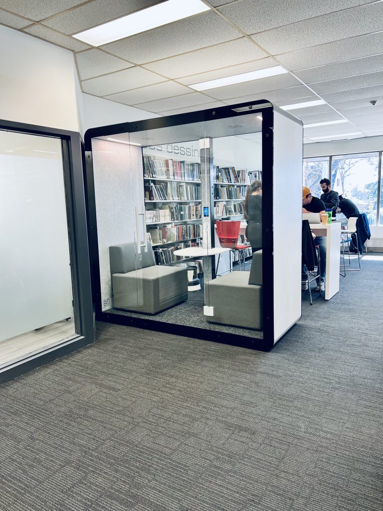 Accessible floorless pod, providing a calm, inclusive, and comfortable space in an open-concept library that lacks quiet study areas. Installed in a leased space, the booth provides an immediate solution and can be relocated easily if or when the library moves.
