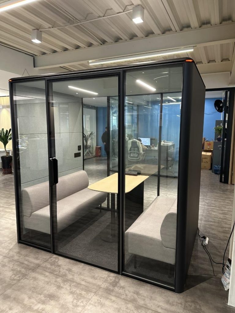 Sol sans seuil et ouverture large pour une accessibilité optimale. Sièges confortables pour 4 personnes favorisant la collaboration et des réunions productives. Tableau blanc et support écran en option pour améliorer le travail d’équipe.